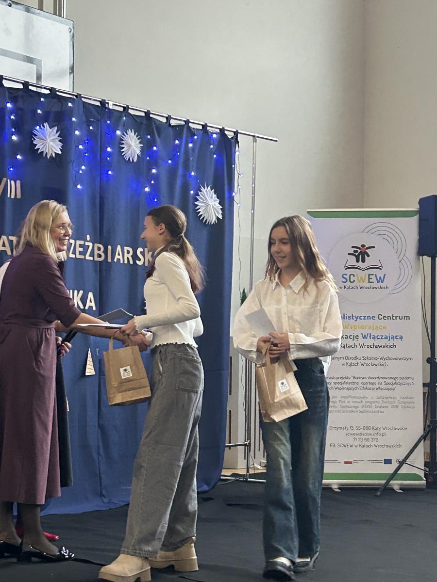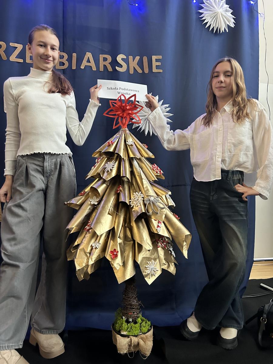 Z wielką radością informuję, że dwie uczennice z klasy VI F Kornelia Paszkowska i Matylda Nowak zajęły I miejsce w konkursie na najlepszą eko - choinkę podczas XXVIII Warsztatów Rzeźbiarskich, które odbyły się 05.12.2025 roku w Specjalnym Ośrodku Szkolono - Wychowawczym w Kątach Wrocławskich.